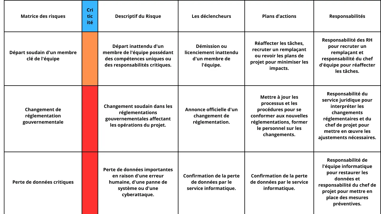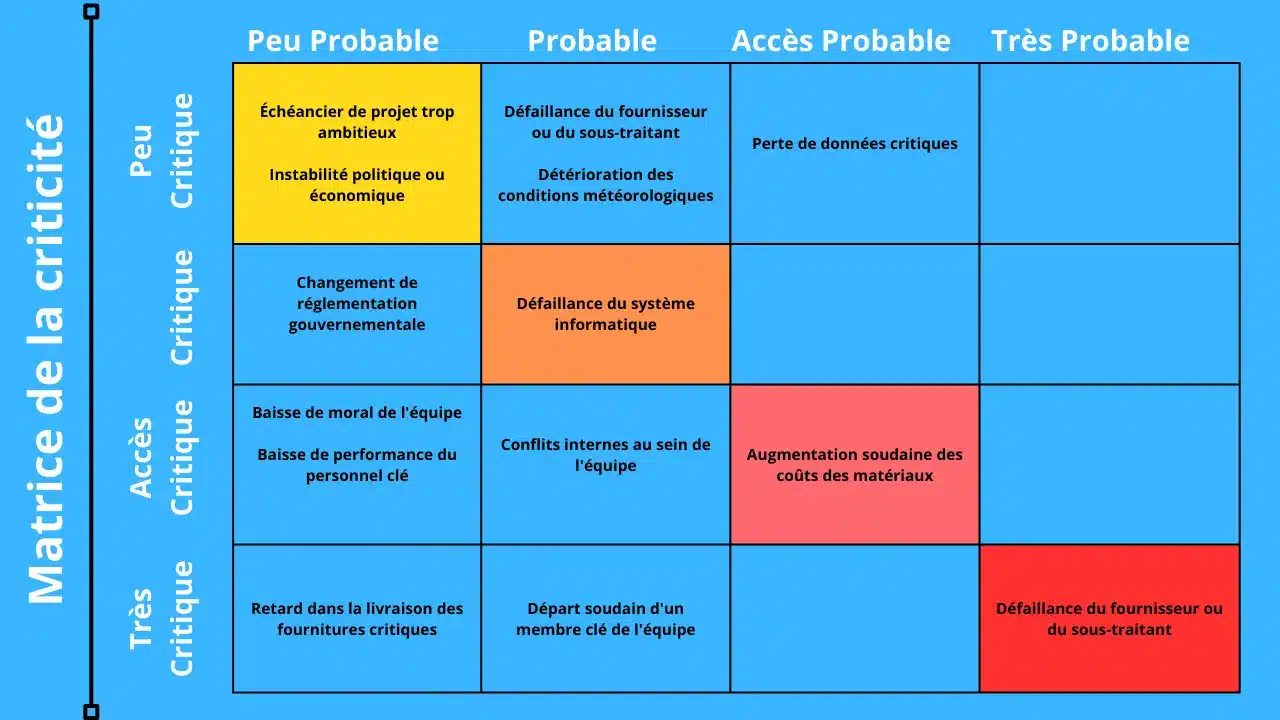 Il est essentiel de documenter tous les risques identifiés, y compris leur description, leurs causes potentielles, leur impact sur le projet, leur probabilité d’occurrence et les actions prévues pour les gérer. Cette documentation peut intégrer toutes les ressources nécessaires pour fournir une connaissance avérée des risques liés au projet. Par ailleurs, les deux matrices conçues à cet effet : Matrice de la criticité et la Matrice 5/15, permettent de quadriller parfaitement la gestion des risques de projet.