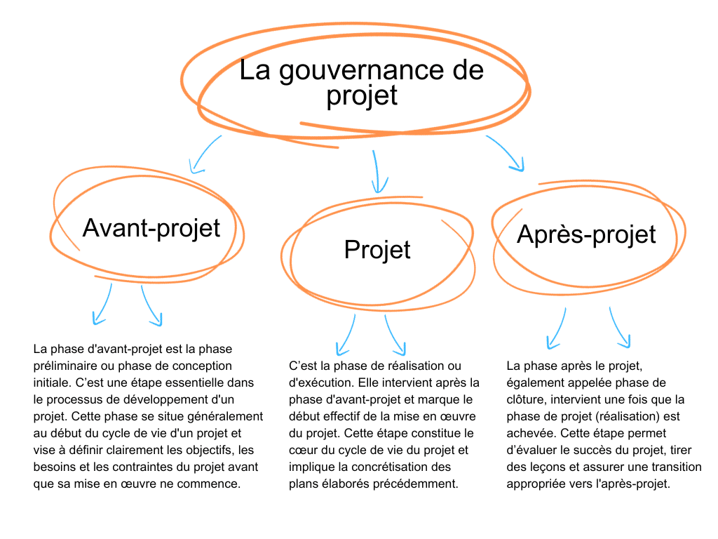 Comprendre la gouvernance de projet ou les procédures et les principes d’une gouvernance de projet, reviens à comprendre comment assurer ses trois grandes phases: La phase d’avant-projet, La phase de projet et La phase d’après-projet.